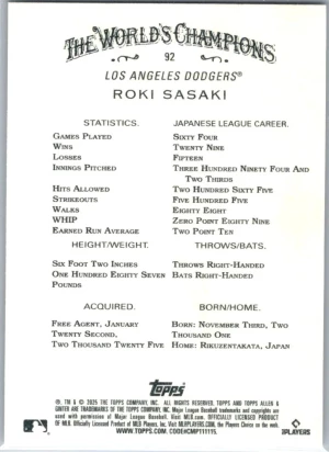 2025 Topps Allen & Ginter #92 Roki Sasaki