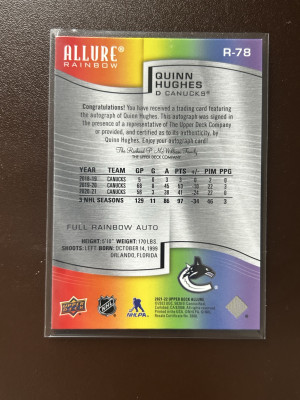 2021-22 Allure Quinn Hughes R-78 Full Rainbow Auto