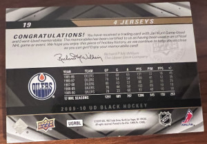2009-10 Jari Kurri Upper Deck UD Black #19 4 Jerseys quad patch /99