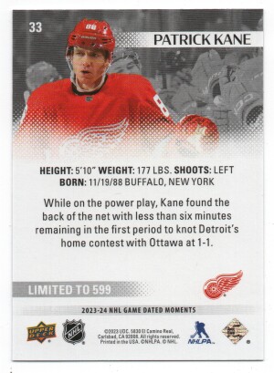 Patrick Kane /599 - 2023-24 Upper Deck Game Dated Moments #33 - December 9, 2023