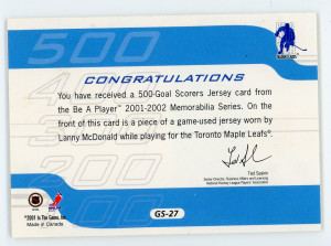 2001-02 Be a Player Memorabilia #GS-27 Lanny McDonald 500 Goals Jersey