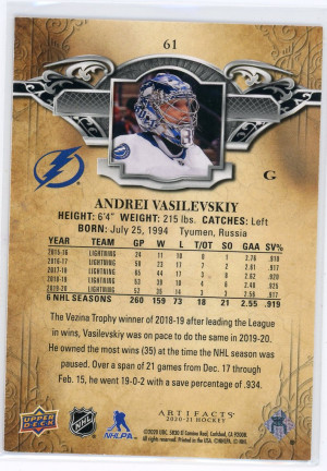 2020-21 Artifacts Copper #61 Andrei Vasilevskiy /299