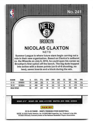 2019-20 Hoops Premium Stock #241 Nicolas Claxton (RC) - Brooklyn Nets