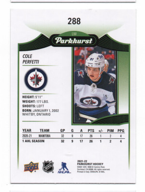 2021-22 Upper Deck Parkhurst ePack Bronze Border Parallel #288 Cole Perfetti RC