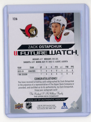 see description 2024-25 SP Authentic Zack Ostapchuk Future Watch Autograph /599 Horizontal ***VF***