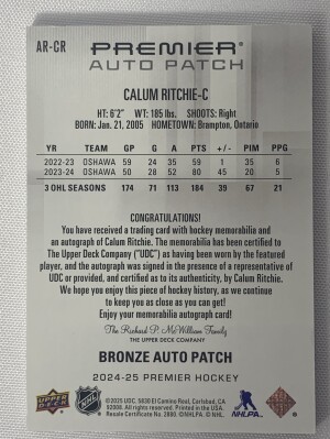 2024-25 Upper Deck Premier Calum Ritchie Rookie Focus Patch Autograph (53/99)