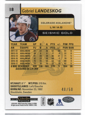 2017-18 O-Pee-Chee Platinum Seismic Gold Parallel #18 Gabriel Landeskog /50
