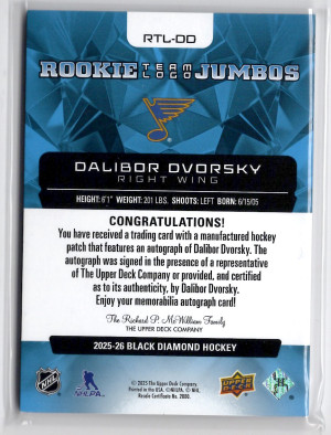 25/26 BLACK DIAMOND ROOKIE TEAM LOGO JUMBOS AUTOGRAPH #RTL-DD DALIBOR DVORSKY RC (84/99)