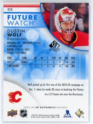 2023-24 SP Authentic #111 Dustin Wolf Future Watch Limited Blue /399