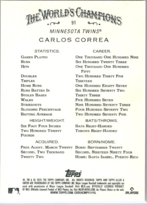 2025 Topps Allen & Ginter #91 Carlos Correa Mint