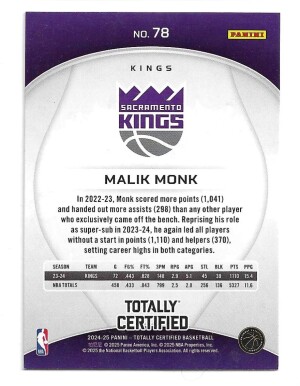 2024-25 Totally Certified #78 Malik Monk - Sacramento Kings