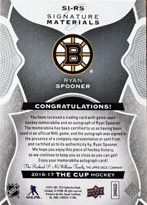 2016-17 Upper Deck The Cup Signature Materials /99, Ryan Spooner
